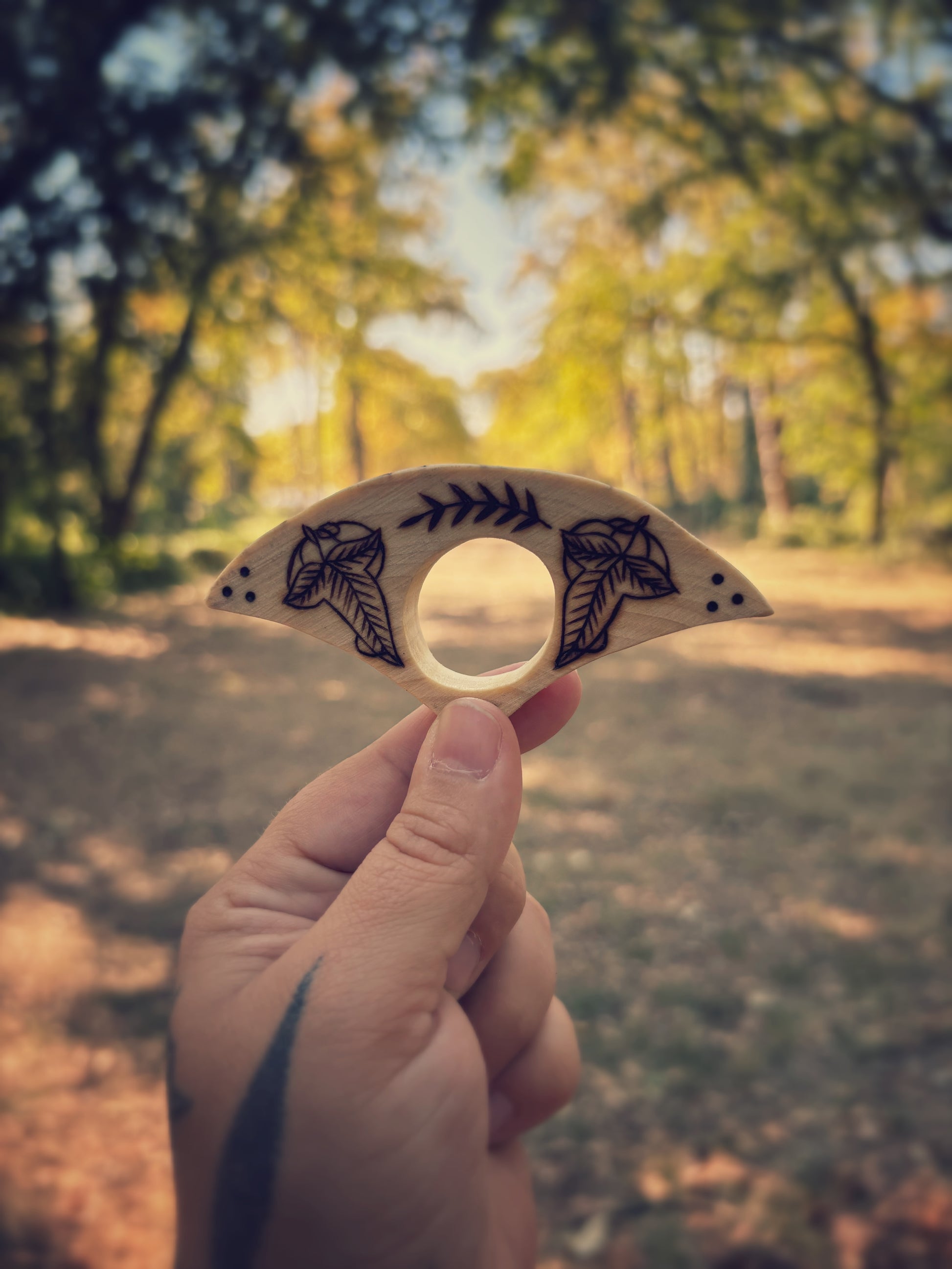 Taillée dans le bois, chaque pièce est unique : les motifs de feuilles et de symboles sont dessinés et gravés à main levée, rendant chaque bague différente — une véritable petite œuvre d’art fonctionnelle.
