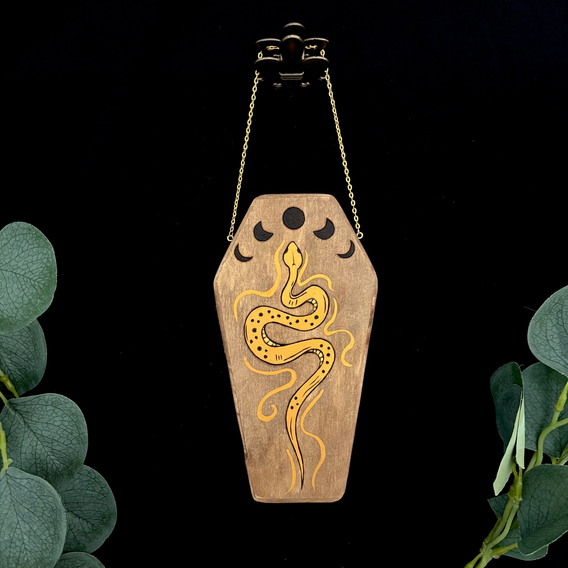 Cette pièce en bois, taillée en forme de cercueil, accueille un serpent ondulant, soigneusement pyrogravé à la main. Symbole ancien de transformation, de savoir caché et de renouveau, le serpent s’enroule comme une pensée interdite dans un écrin de silence.
