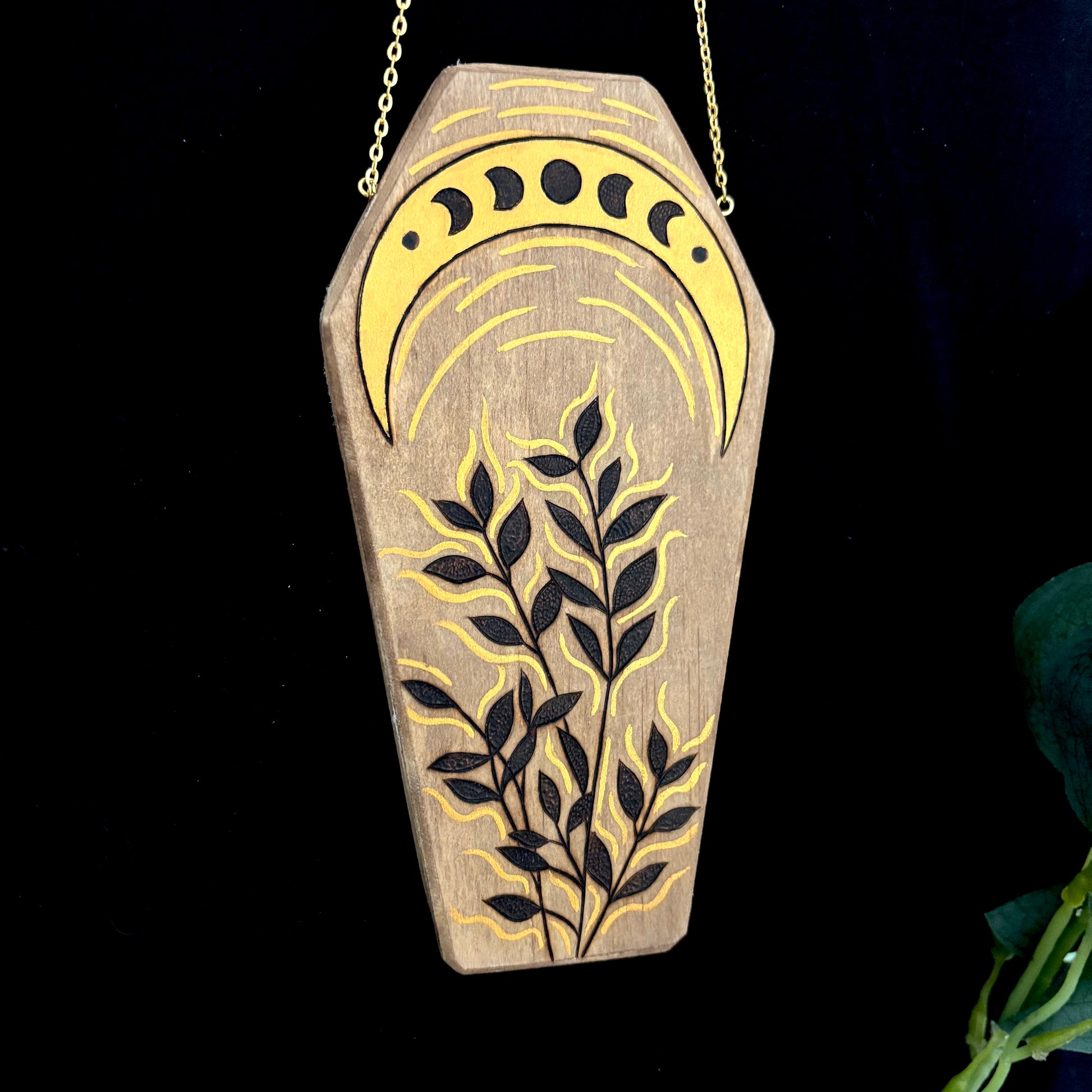 Cette décoration en forme de petit cercueil est une ode au contraste entre l’ombre et la beauté. Pyrogravée à la main, chaque fleur qui s’y déploie raconte une histoire de cycle, de renaissance, de douceur déposée sur l’étrange.