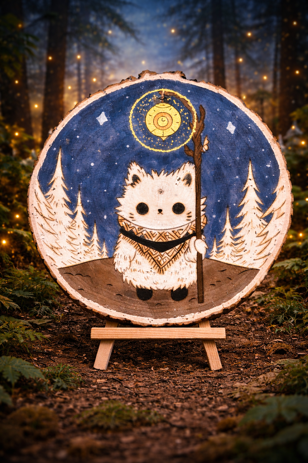 Lorsque la lune se lève, il parcourt les sentiers silencieux avec son bâton étoilé pour veiller sur les créatures endormies.