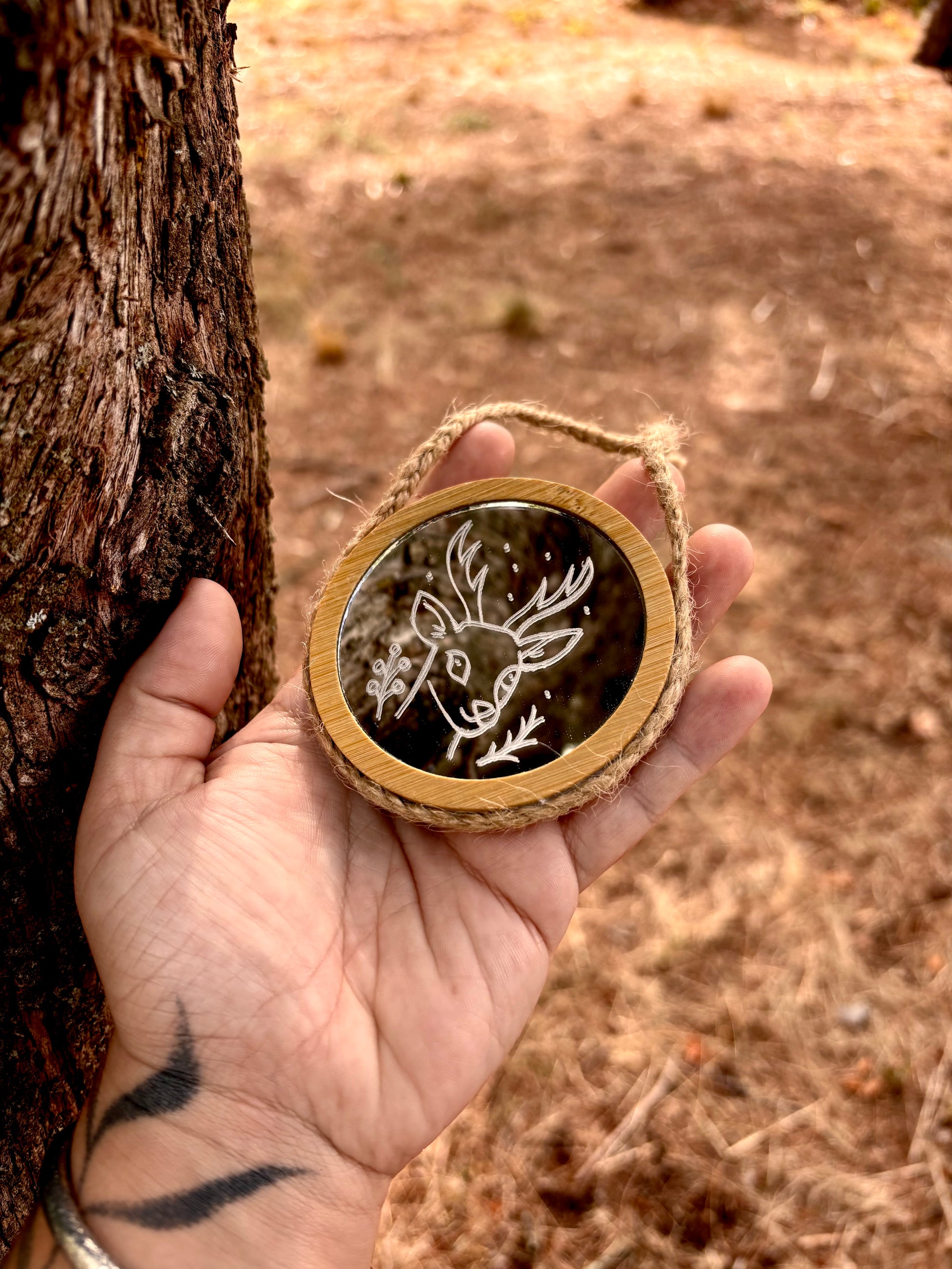 Chaque petit miroir est bien plus qu’un simple objet décoratif : c’est un talisman de clarté et d’intuition, entièrement découpé, pyrogravé et orné à la main.