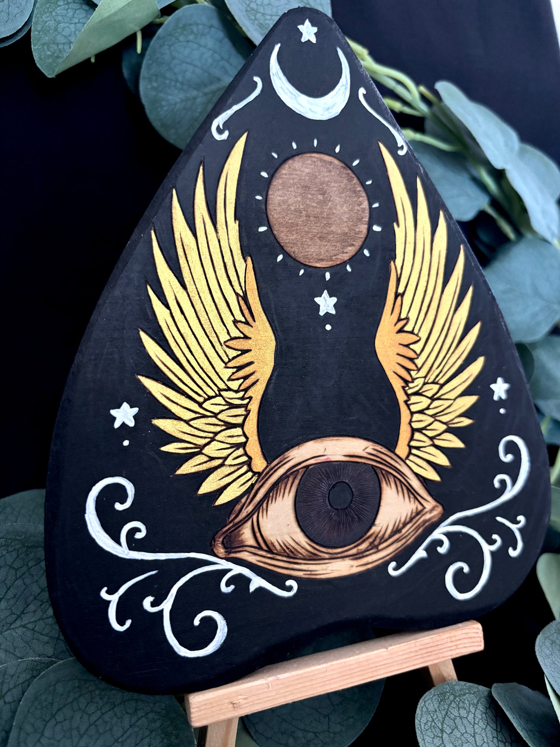 Inspirée des célèbres planches de spiritisme, cette décoration en bois est une création artisanale, entièrement pyrogravée à la main dans mon atelier. Elle ne sert pas à communiquer avec l’au-delà (du moins… pas officiellement), mais elle apporte une ambiance mystérieuse et envoûtante à votre intérieur.